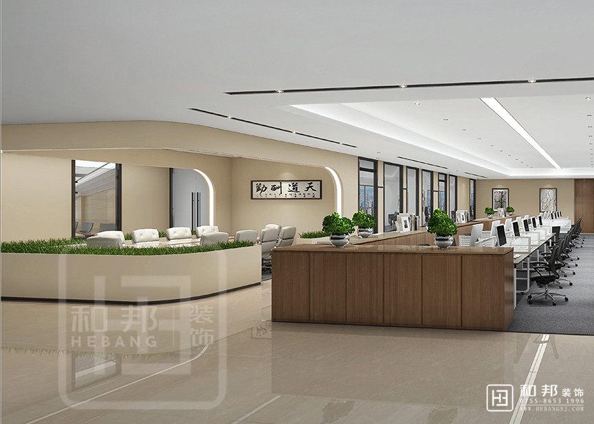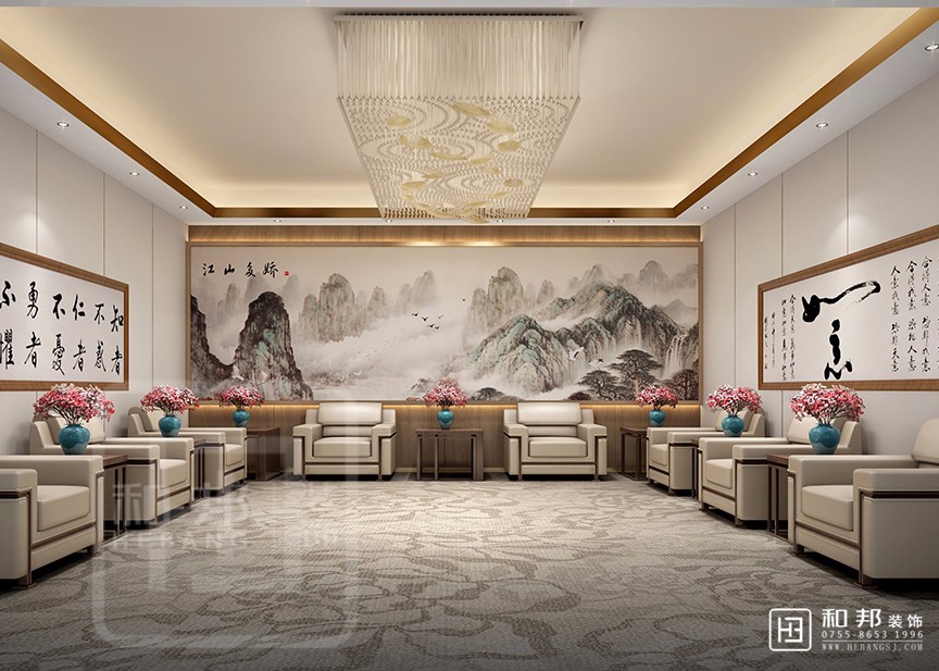 本案使用鯤鵬、迎客松等元素結合 ,綠色辦公的理念,表達其企業文化,寄予集團合作共贏、蓬勃向上的期望。