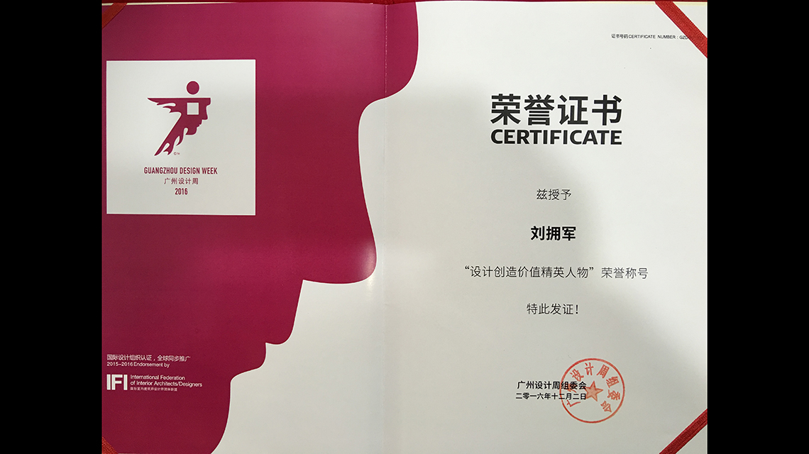 廣州設計周:我司總經(jīng)理兼首席設計總監(jiān)劉擁軍在廣州設計周上發(fā)表了《設計驅動生產(chǎn)力》的精彩演講,在此期間設計總監(jiān)劉擁軍、吳新奮、劉作平三人一并榮獲【設計創(chuàng)造價值精英人物】榮譽稱號!